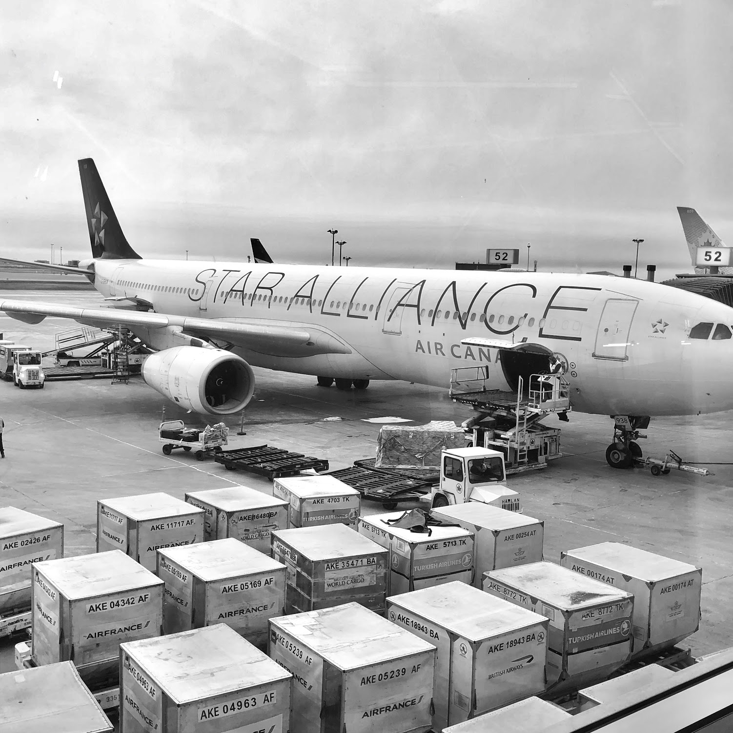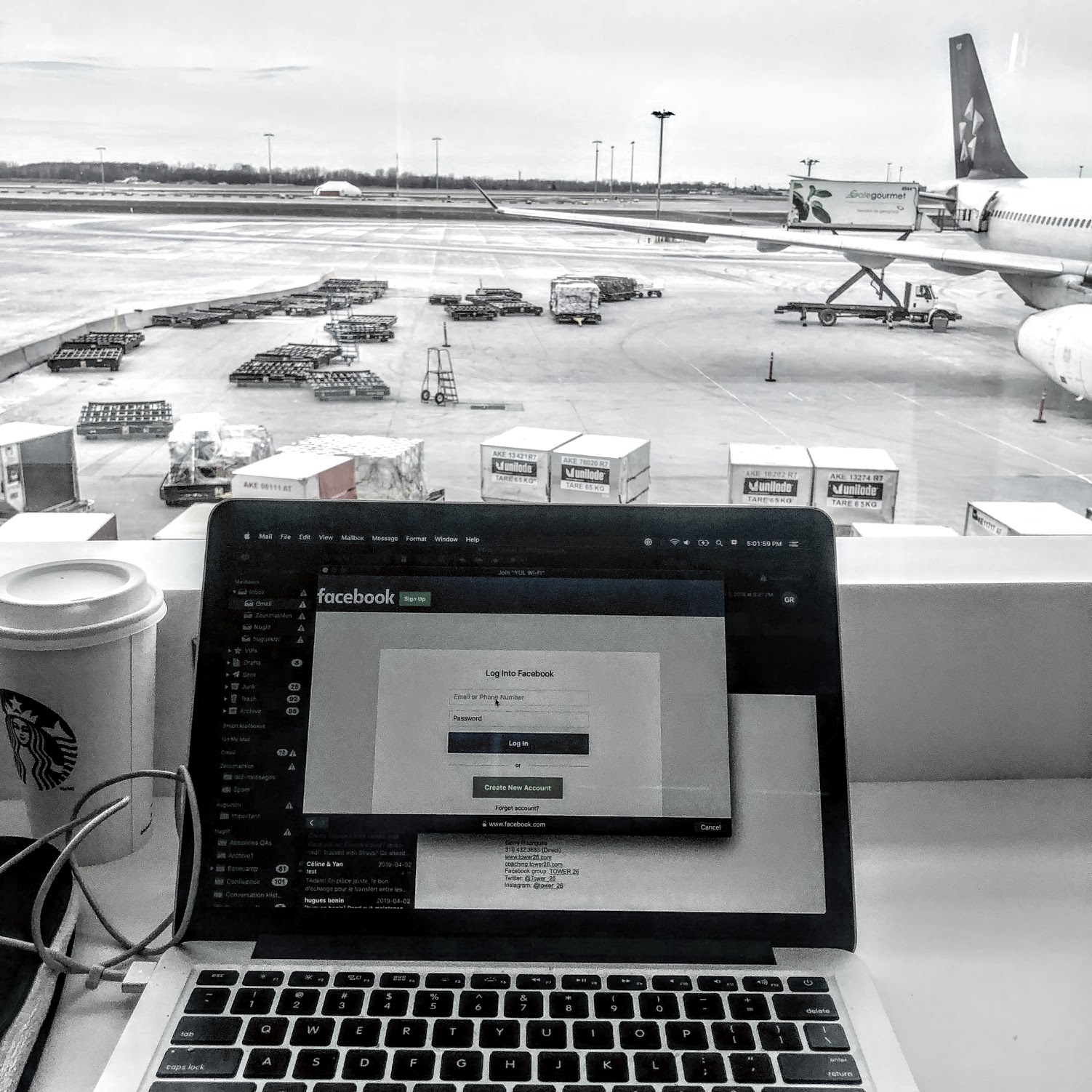 Même si mon vol partira de la porte 59, j’ai trouvé un beau petit coin tranquille avec prises de courant/USB et vue sur la piste, au fond du Starbucks, devant l’Auberge Saint-Gabriel.