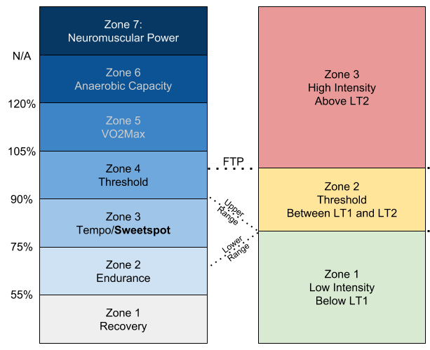 Encore une fois, ce système est un découpage supplémentaire du système à 3 zones qui monte en intensité selon la puissance au seuil (FTP). Il permet des zones plus précises pour les cyclistes: