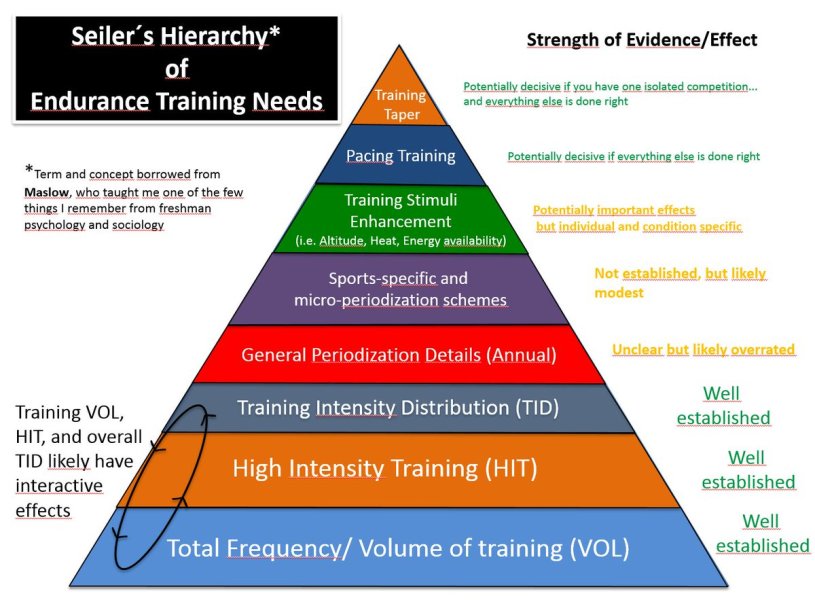 Un peu à la façon d’Abraham Maslow, Stephen Seiler, professeur en science du sport, a dressé une pyramide priorisant les besoins des sports d’endurance. Pour atteindre ses objectifs, l’athlète d’endurance devrait d’abord travailler sur le bas de la pyramide: le volume d’entraînement. Une fois maîtrisé, il pourra remonter en s’attaquant à l’entraînement à haute intensité, etc.